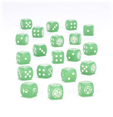 This is a set of 20 six-sided dice with rounded edges for use in games of Warhammer: The Old World, themed around the Armies of Grand Cathay. They are cast in jade green acrylic plastic with white ink pips and designs, and measure 16mm along each edge. On the standard D6s, the 1-5 facings are traditionally pipped, and each '6' face is decorated with the draconic icon of Grand Cathay.