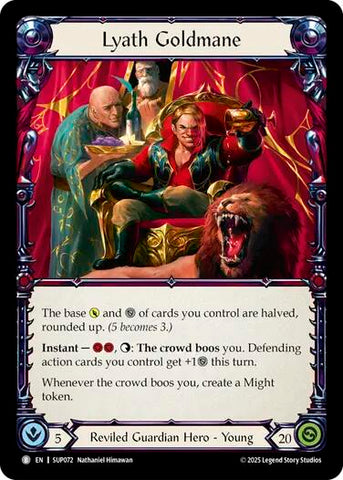 The base POWER and DEFENSE of cards you control are halved, rounded up. Instant — [2 Resource], {t}: The crowd boos you. Defending action cards you control get +1{d} this turn. Whenever the crowd boos you, create a Might token.